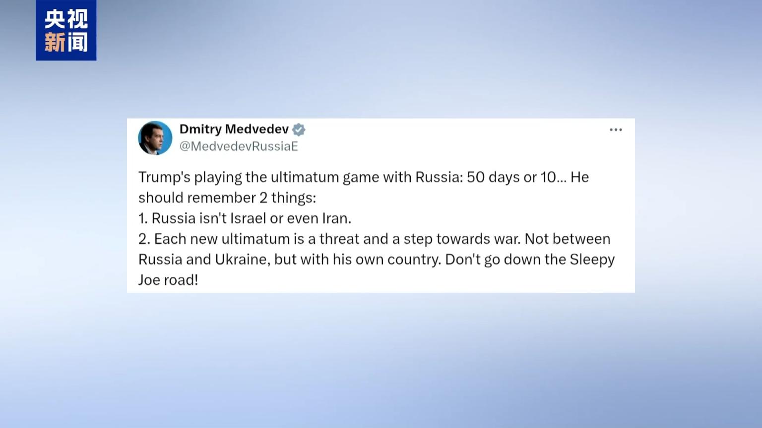 对于特朗普此番言论,俄罗斯安全会议副主席梅德韦杰夫表示,特朗普在和俄罗斯玩“最后通牒”的游戏,不管是50天还是10天。每一次新的最后通牒都是一种威胁,是迈向战争的一步。